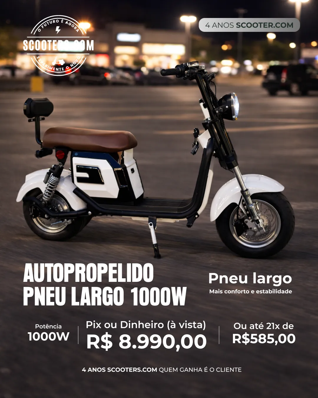 Trabalhamos com modelos de scooter elétrica 1000W, versões com pneu largo para mais estabilidade, autonomia ideal para deslocamentos urbanos e design moderno.